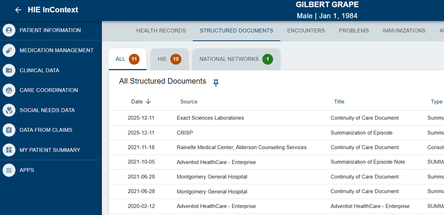- Clinical Summary Documents (Structured Documents), including parsed tabs for specific data points such as Allergies and Vitals