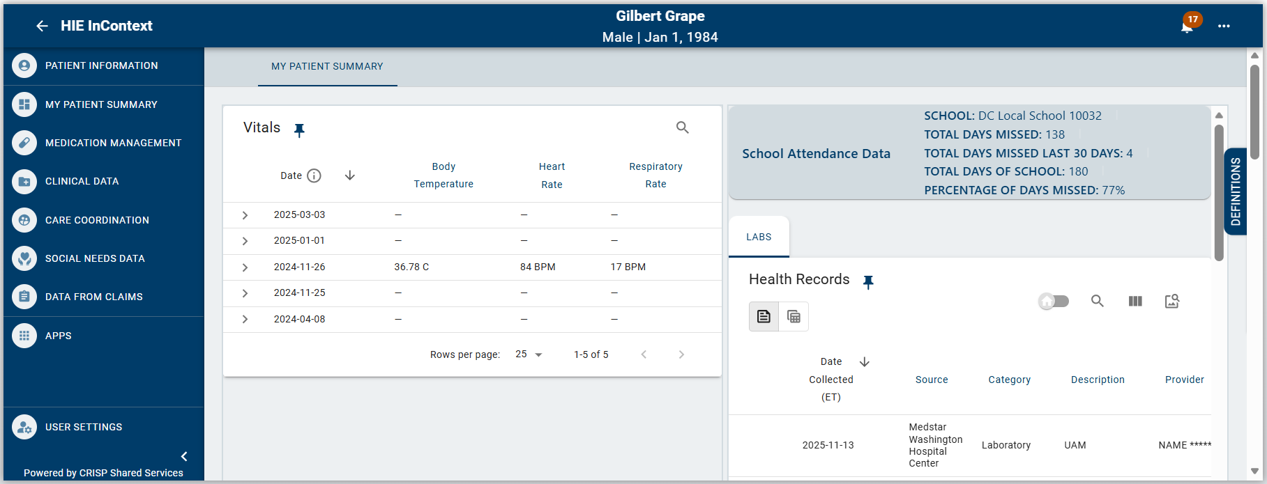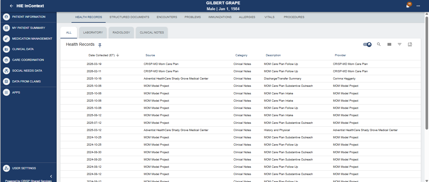 InContext provides access to the full breadth of clinical and non-clinical data CRISP has received on a patient — giving clinicians a comprehensive view without switching between systems. Key data available in the tool includes:
