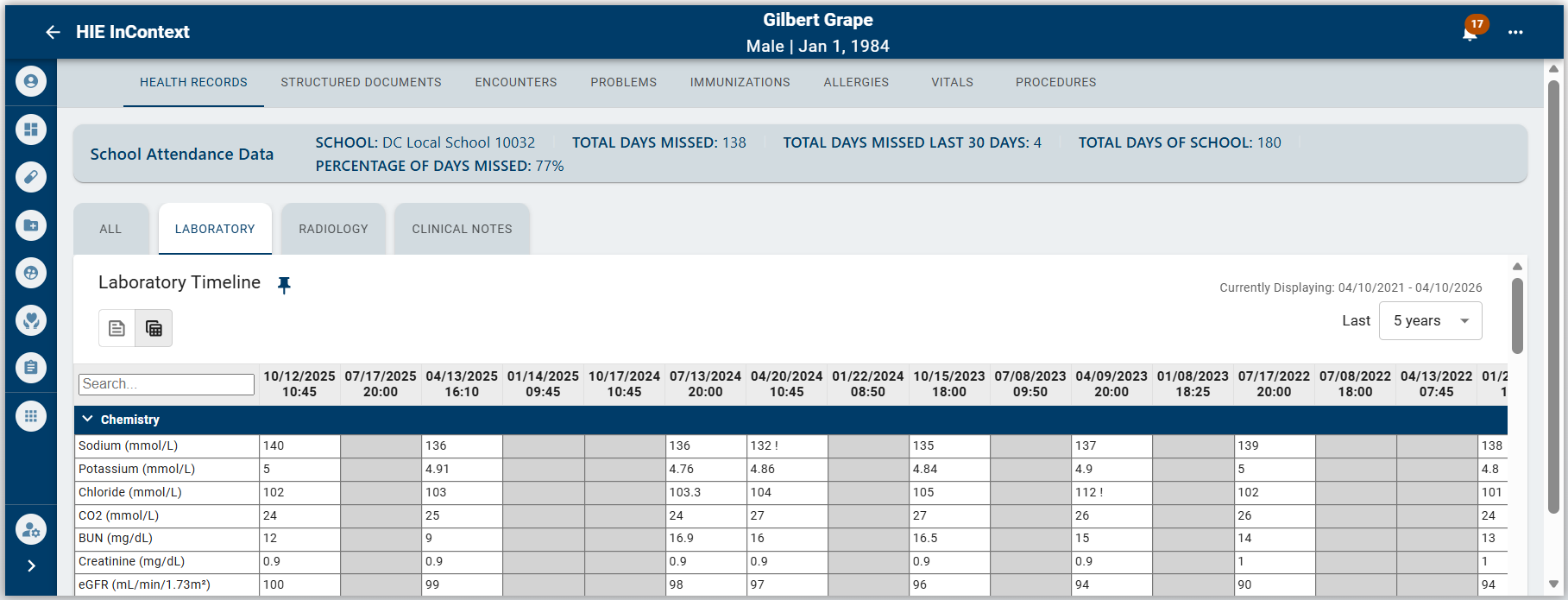 Patient laboratory data is available to view in two different formats: the default list view, and timeline view. In timeline view, users can scroll through a timeline with up to five years of available lab data.